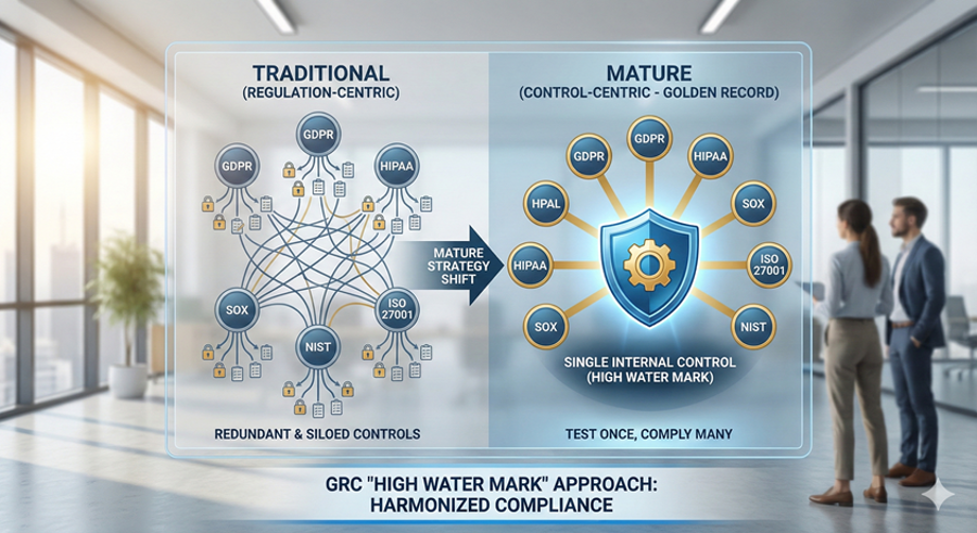 The most mature GRC (Governance, Risk, and Compliance) strategies move away from chasing regulations and start focusing on controls. The methodology is often called the "Golden Record" or the "High Water Mark" approach.